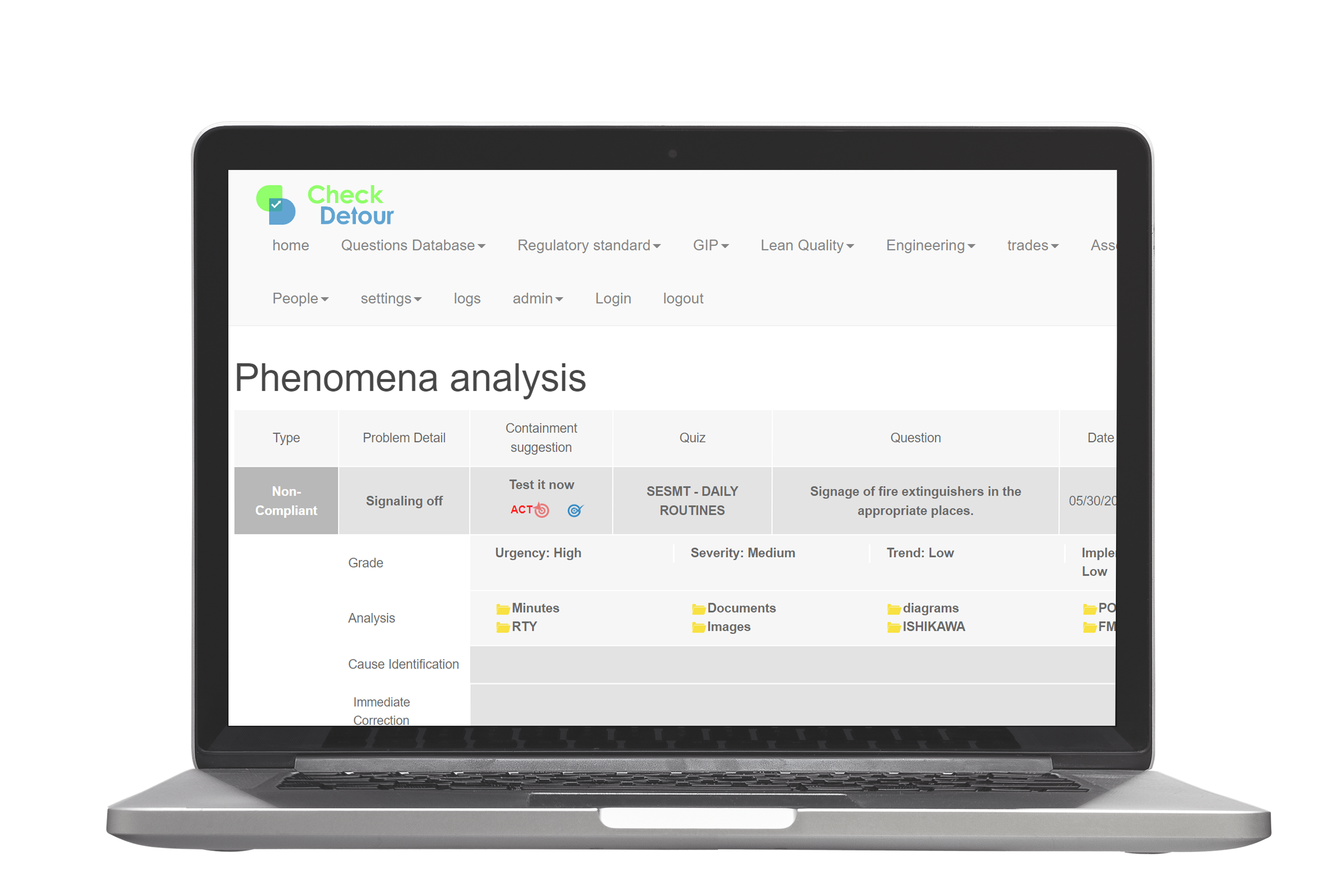 CheckDetour is a management support tool. Your proposal is to collect information and data to evaluate. The evaluation focus first knowing the data about the evaluated object: machines, production processes, environment, quality standards, legal requirements, professional teams.